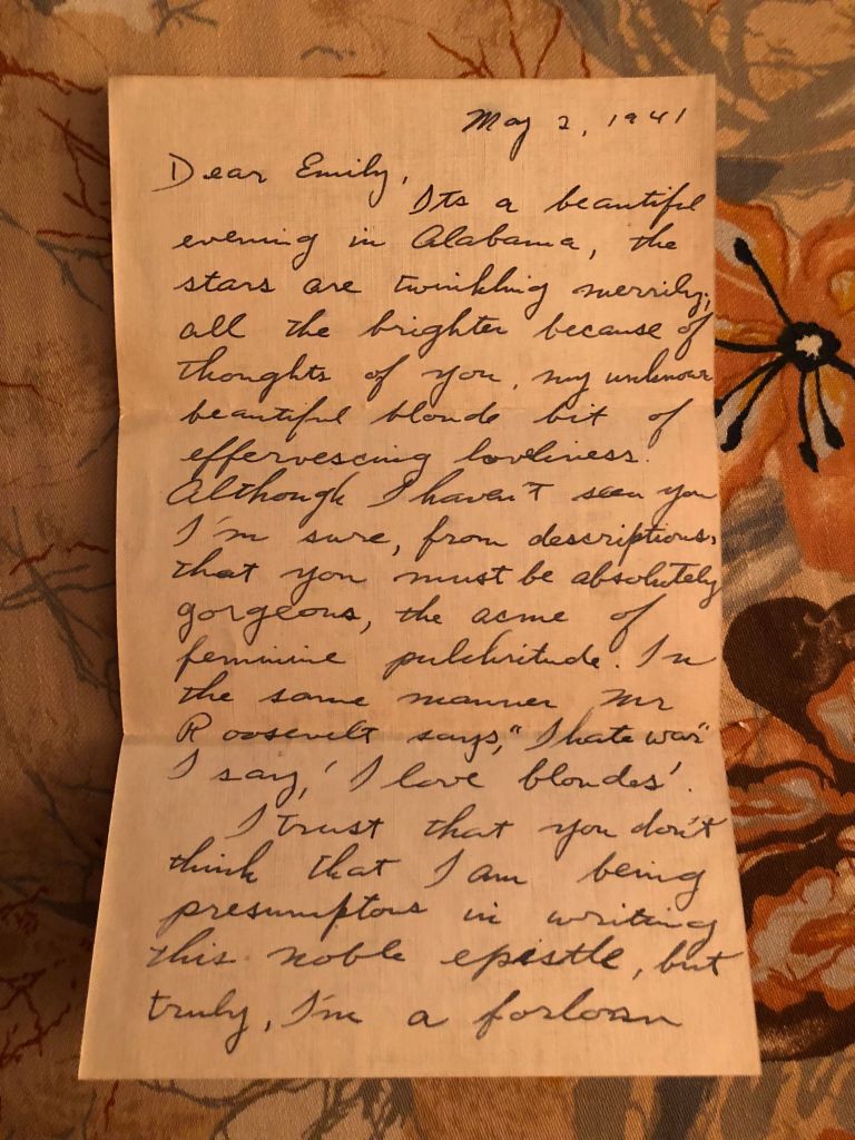 It’s a beautiful evening in Alabama, the stars are twinkling merrily; all the brighter because of thoughts of you, my unknown beautiful blonde bit of effervescing loveliness. Although I haven’t seen you I’m sure, from descriptions, that you must be absolutely gorgeous, the acme of feminine pulchritude. In the same manner Mr. Roosevelt says, “I hate war” I say, “I love blondes!”