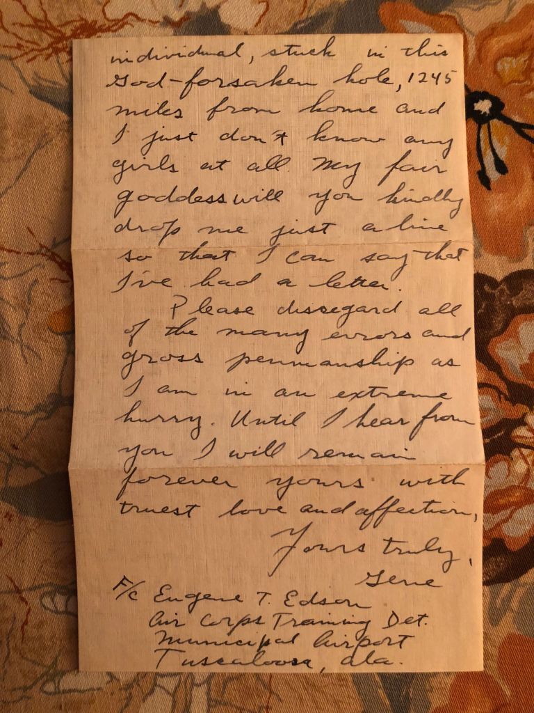 I trust that you don’t think that i am being presumptuous in writing this noble epistle, but truly, I’m a forlorn individual, stuck in this God-forsaken hole 1245 miles away from home and I just don’t know any girls at all. My fair goddess will you drop me just a line so that I can say that I’ve had a letter.
