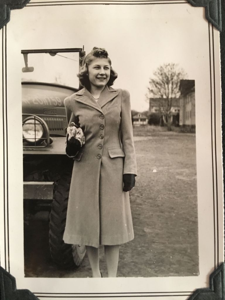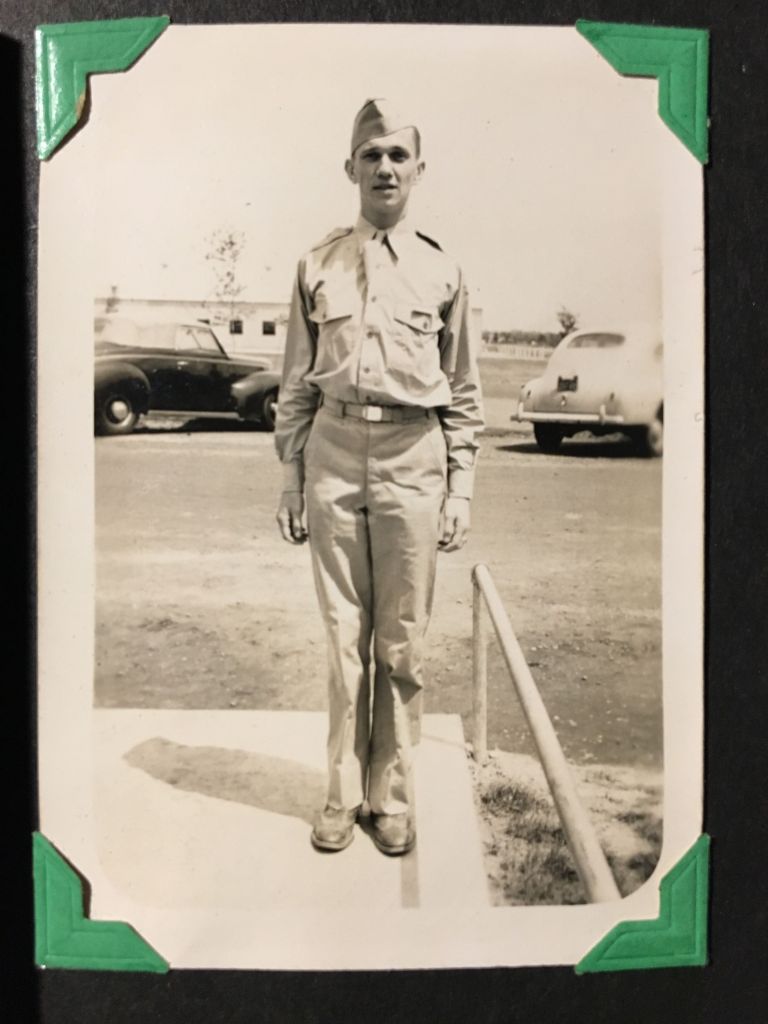 I was going to ask you to send a small picture of yourself as I have no room for your big picture which is all by itself with a pile of excess clothes up in the attic. But the picture I took of you next to the army truck will do for now. It’s “purdy” no kidding.