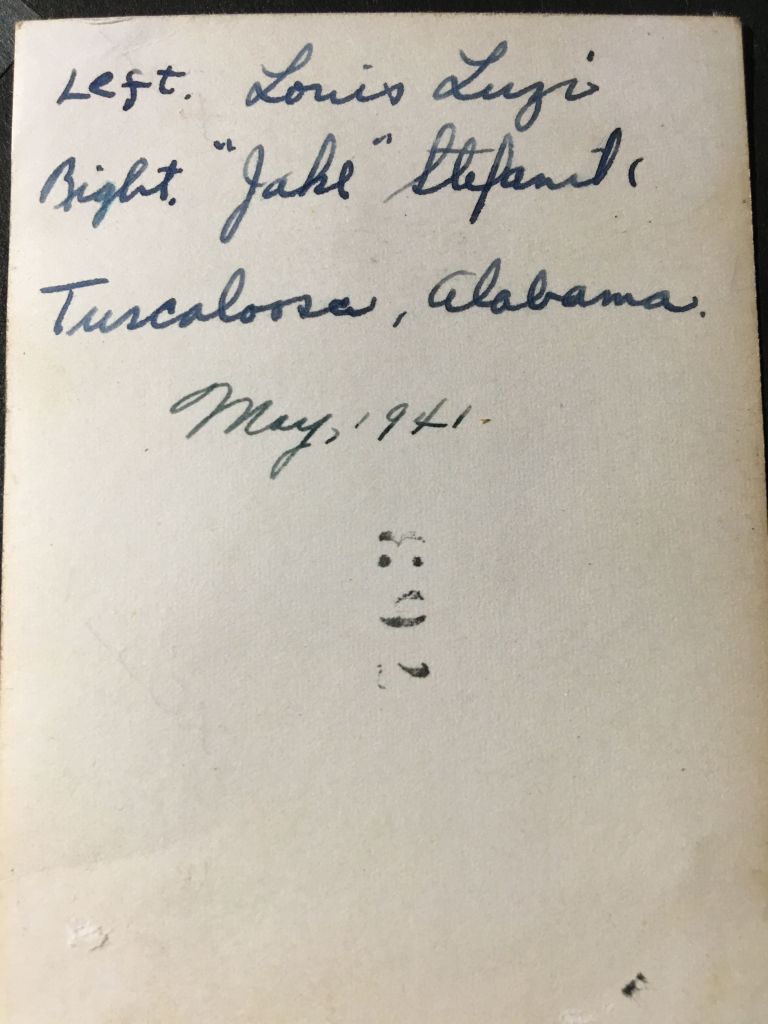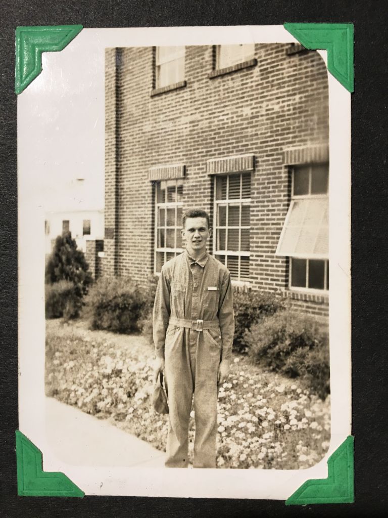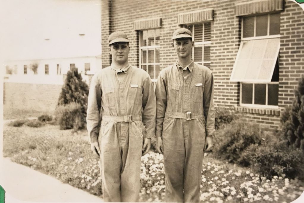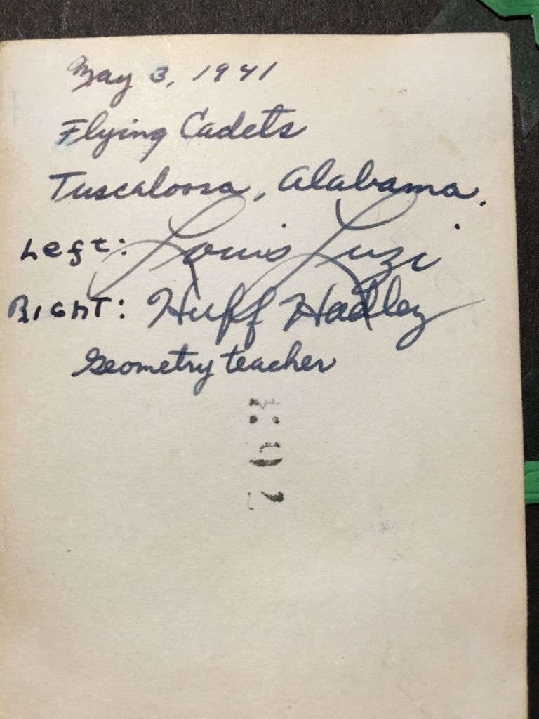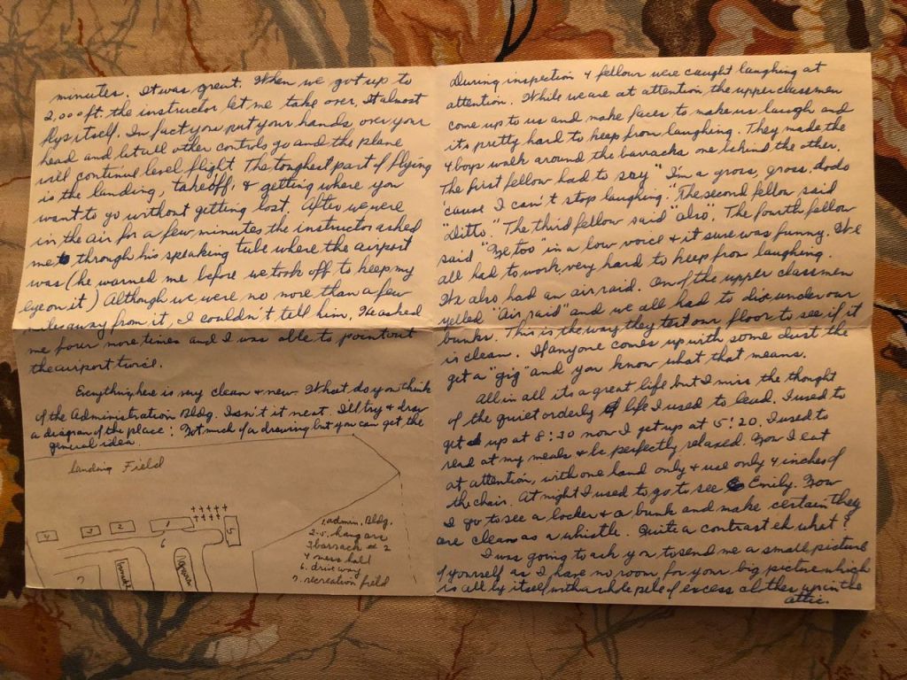 I’m returning all the pictures you sent except 2 and want to thank you for remembering to get them. Also, I am enclosing a few pictures that I took down here. Do you agree with me that I look like a convict? The two fellows whose pictures I am enclosing bunk right next to me. Both are swell fellows. This Sunday if we have time we expect to take some pictures of the planes we fly and of ourselves in our regular uniforms. O, yes I finally went up in a plane. For the last two days we’ve been on the ground on account of poor visibility. But Monday I was up for 33 minutes. It was great. When we got up to 2,000 feet the instructor let me take over. It almost flies itself. In fact you put your hands over your head and let all other controls go and the plane will continue level flight. The toughest part of flying is the landing, take off, and getting to where you want to go without getting lost. After we were in the air for a few minutes the instructor asked me through his speaking tube where the airport was (he warned me before we took off to keep my eye on it). Although we were no more than a few miles away from it, I couldn’t tell him. He asked me four more times and I was able to point out the airport twice. Everything here is very clean and new. What do you think of the administration building. Isn’t it neat.