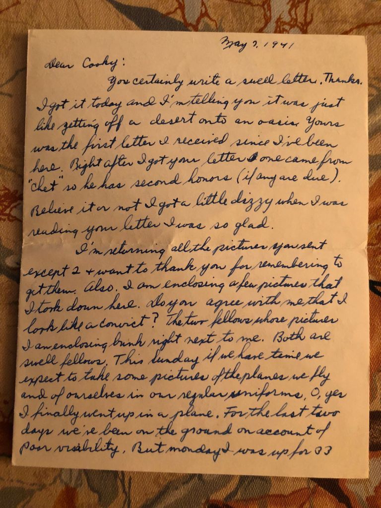 You certainly write a swell letter. Thanks. I got it today and I’m telling you it was just like getting off a desert onto an oasis. Yours was the first letter I received and one came from “Chet” so he has second honors (if any are due.) Believe it or not I got a little dizzy when I was reading your letter I was so glad.