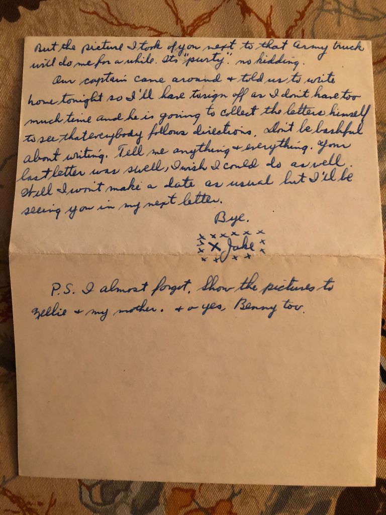 Our captain came around and told us to write home so I’ll have to sign off as I don’t have too much time and he is going to collect the letters himself to see that everybody follow directions. Don’t be bashful about writing. Tell me anything and everything. Your last letter was swell. I wish I could do as well. Well I wont make a date as usual but I’ll be seeing you in the next letter.