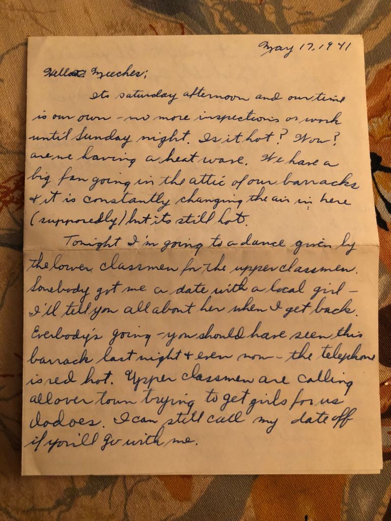 Tonight I’m going to a dance given by the lower classmen for the upper classmen. Somebody got me a date with a local girl-I’ll tell you all about her when I get back. Everybody’s going – you should have seen this barrack last night and even now – the telephone is red hot. Upper classmen are calling all over town trying to get girls for us dodoes. I can still call my date off if you’ll go with me.