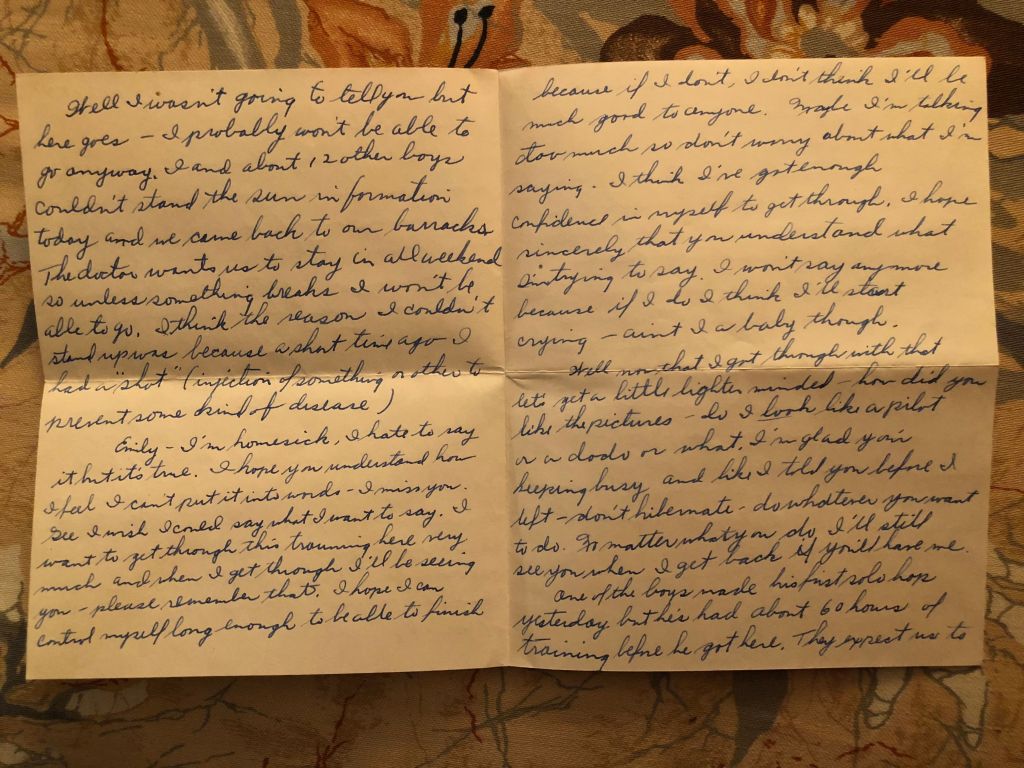 Emily-I’m homesick. I hate to say it but it’s true. I hope you understand how I feel I can’t put it in words- I miss you. Gee I wish I could say what I want to say. I want to get through this training here very much and when I get through I’ll be seeing you. Please remember that. I hope I can control myself long enough to be able to finish because if I don’t I don’t think I’ll be much good to anyone. Maybe I’m talking too much so don’t worry about what I’m saying. I think I’ve got enough confidence in myself to get through.