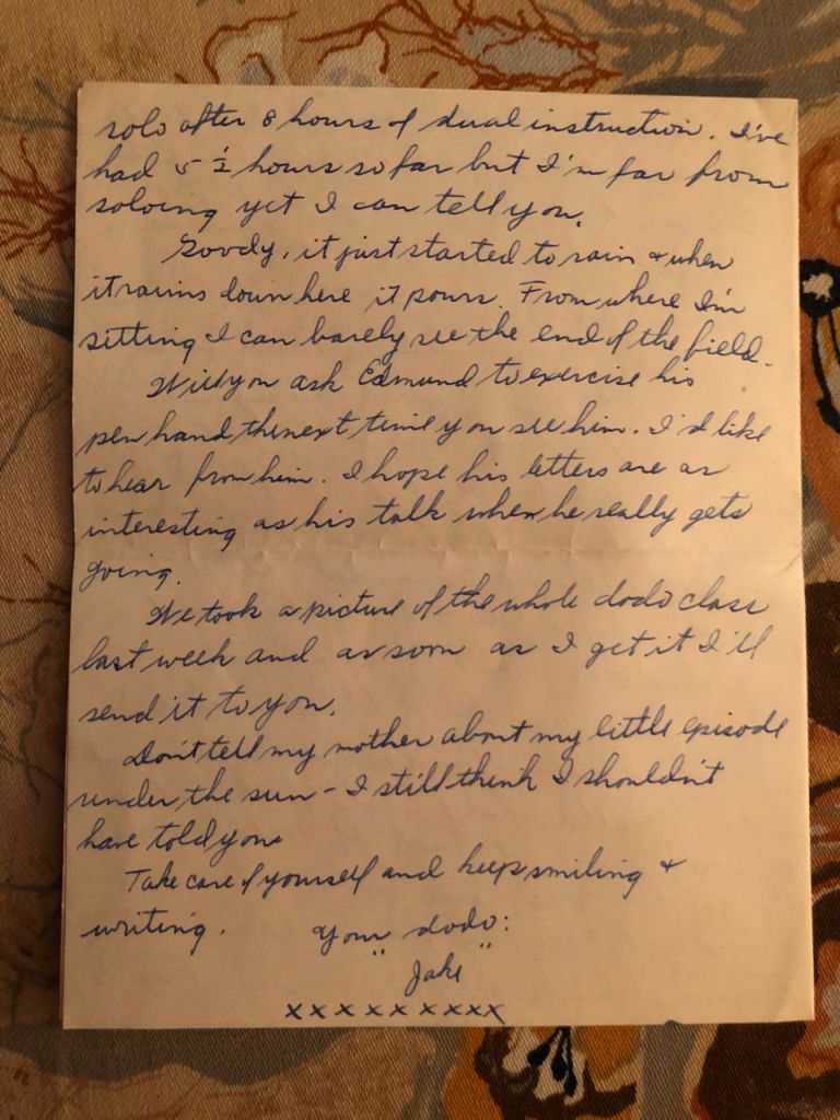 Well now that I’ve got through with that let’s get a little lighter minded-how did you like the pictures-do I look like a dodo or a pilot or what. I’m glad you’re keeping busy and like I told you before I left-don’t hibernate-do whatever you want to do. No matter what you do I’ll still see you when I get back if you’ll have me.