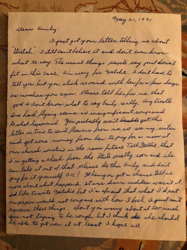 I just got your letter telling me about “Stretch.” I still can’t believe it and don’t know what to say. The usual things people say just doesn’t fit in this case. I’m sorry for Natalie. I don’t have to tell you but stick around with her for a few days for as much as you can. Please tell her for me that god I don’t know what to say Emily really. Any trouble I’ve had flying seems so insignificant compared to what happened. You probably wont get this letter in time to send flowers from me so see my sister and get some money from her to pay for a mass at our church sometime in the near future. Tell Nellie that I’m getting a check from the state pretty soon and she can take it out of that. Please do this Emily and don’t pay for it yourself, O.K.? When you get a chance tell me more about what happened. It was darn sudden wasn’t it. I’d like to write Natalie but I’m afraid what I’d put on paper would not compare with how I feel. I just can’t express these things. Don’t you worry about it too much. I’m not trying to be rough but I think she should be able to get over it at least I hope so