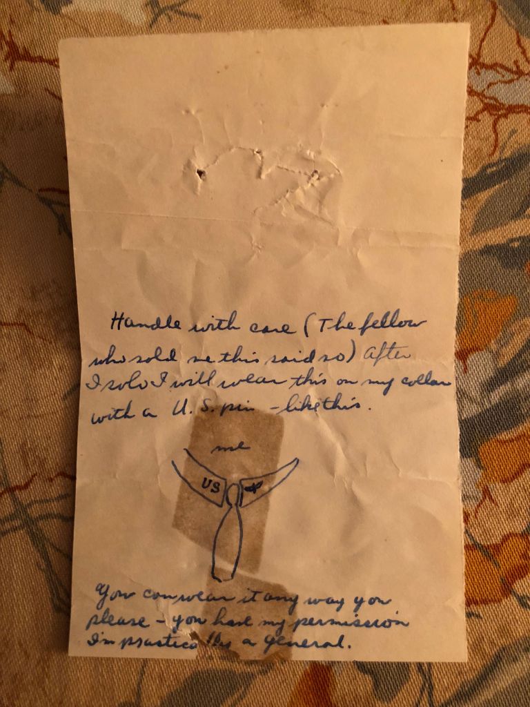Handle with care (the fellow who sold me this said so) After I solo I will wear this on my collar with a U.S. pin-like this. You can wear it any way you please-you have my permission. I’m practically a general.